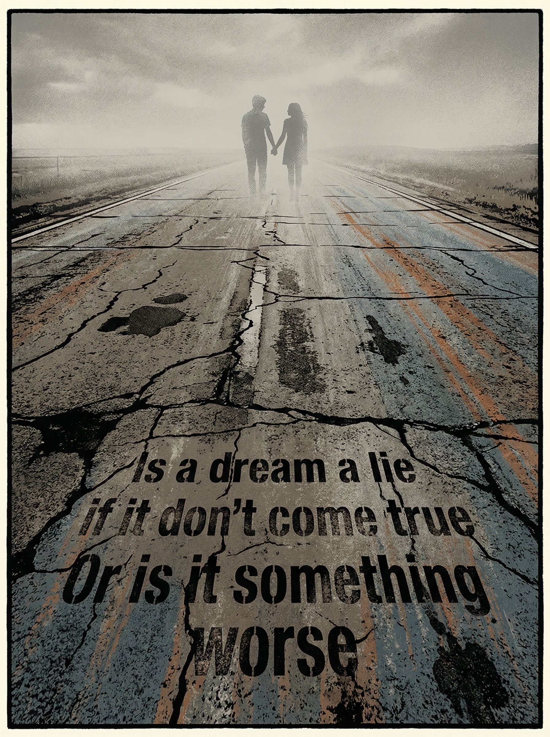 This artwork captures the Somber Reflection, Faded Hope, Existential Dread mood of Bruce Springsteen's "The river", specifically exploring themes of Disillusionment and Unfulfilled Dreams. Drawing from Early 1980s American heartland rock, post-industrial decline, socio-economic anxieties of the Reagan era. Heartland Rock aesthetics, the design features Stark, gritty realism with a poetic, melancholic undertone. Captures the desolate beauty of forgotten American landscapes and the weight of unfulfilled promises. visuals with a palette of Dusty denim blue, Faded sepia brown, Gritty concrete grey.