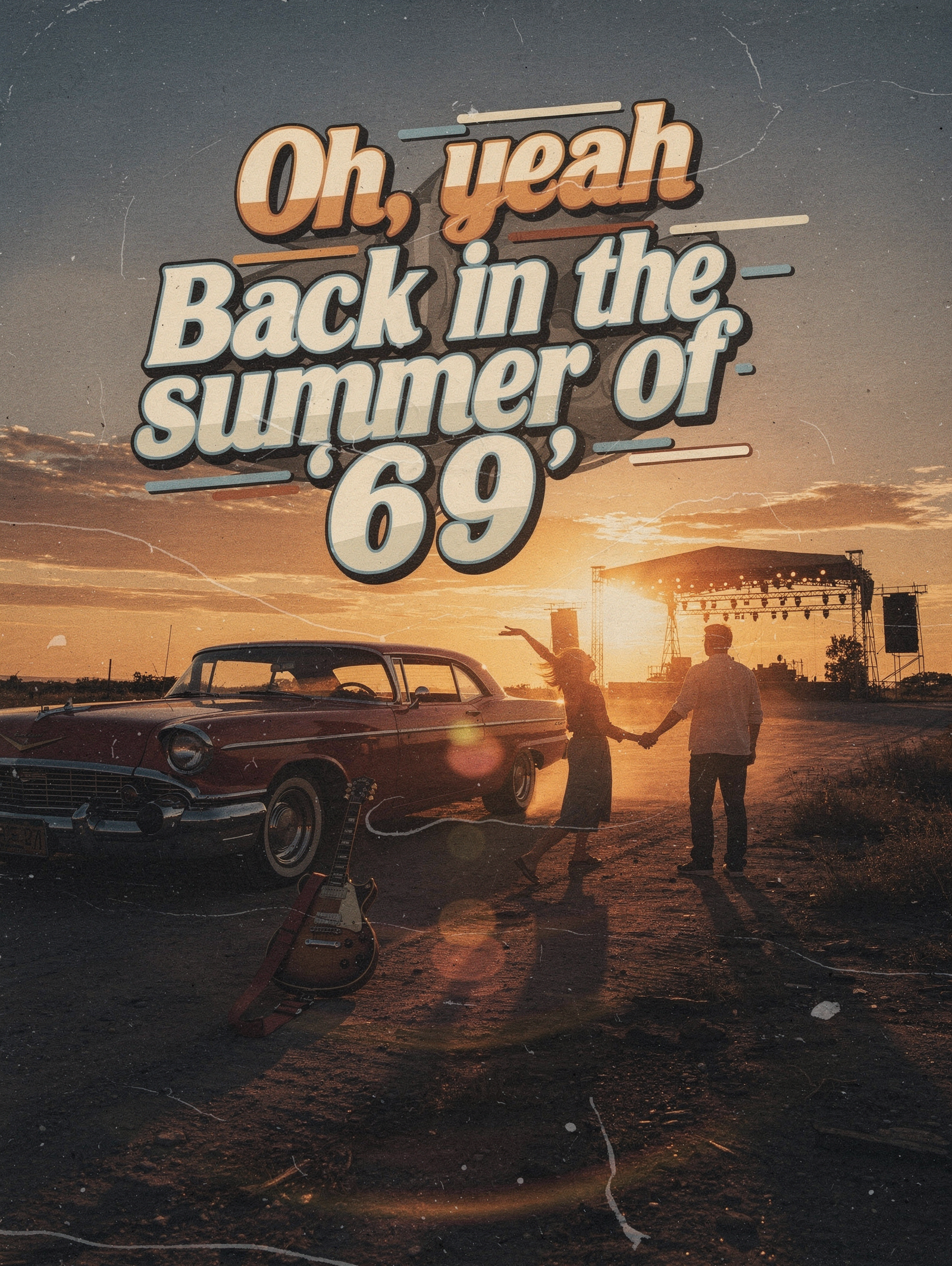 This artwork captures the Energetic Nostalgia mood of Bryan Adams's "Summer of 69", specifically exploring themes of Youthful freedom and Summer romance. Drawing from 80s Arena Rock Pop Rock aesthetics, the design features Retro 80s Americana, faded photographic, energetic and warm, classic rock concert poster aesthetic. visuals with a palette of Sunburst Orange, Denim Blue, Cream White.