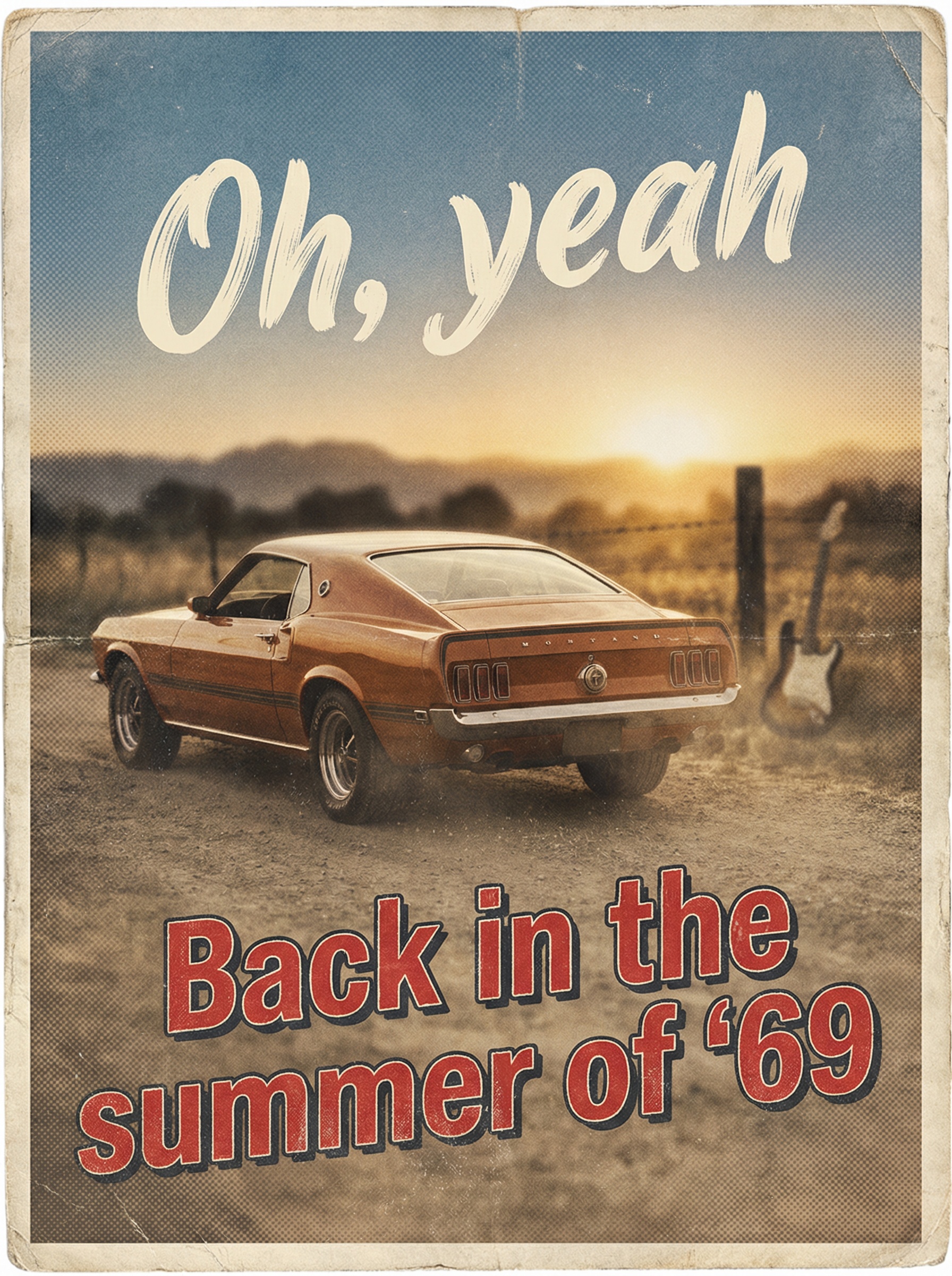 This artwork captures the Nostalgic, carefree, wistful mood of Bryan Adams's "Summer of 69", specifically exploring themes of Nostalgia and Youth. Drawing from Mid-to-late '80s stadium rock, evoking the idealized memory of late '60s youth culture Heartland Rock, Pop Rock, Arena Rock aesthetics, the design features Warm, retro-photographic aesthetic with a slight grain and soft focus, blending '80s rock sincerity with '60s summer idylls and a touch of Americana. visuals with a palette of Sun-faded denim blue, Golden hour amber, Faded crimson red.