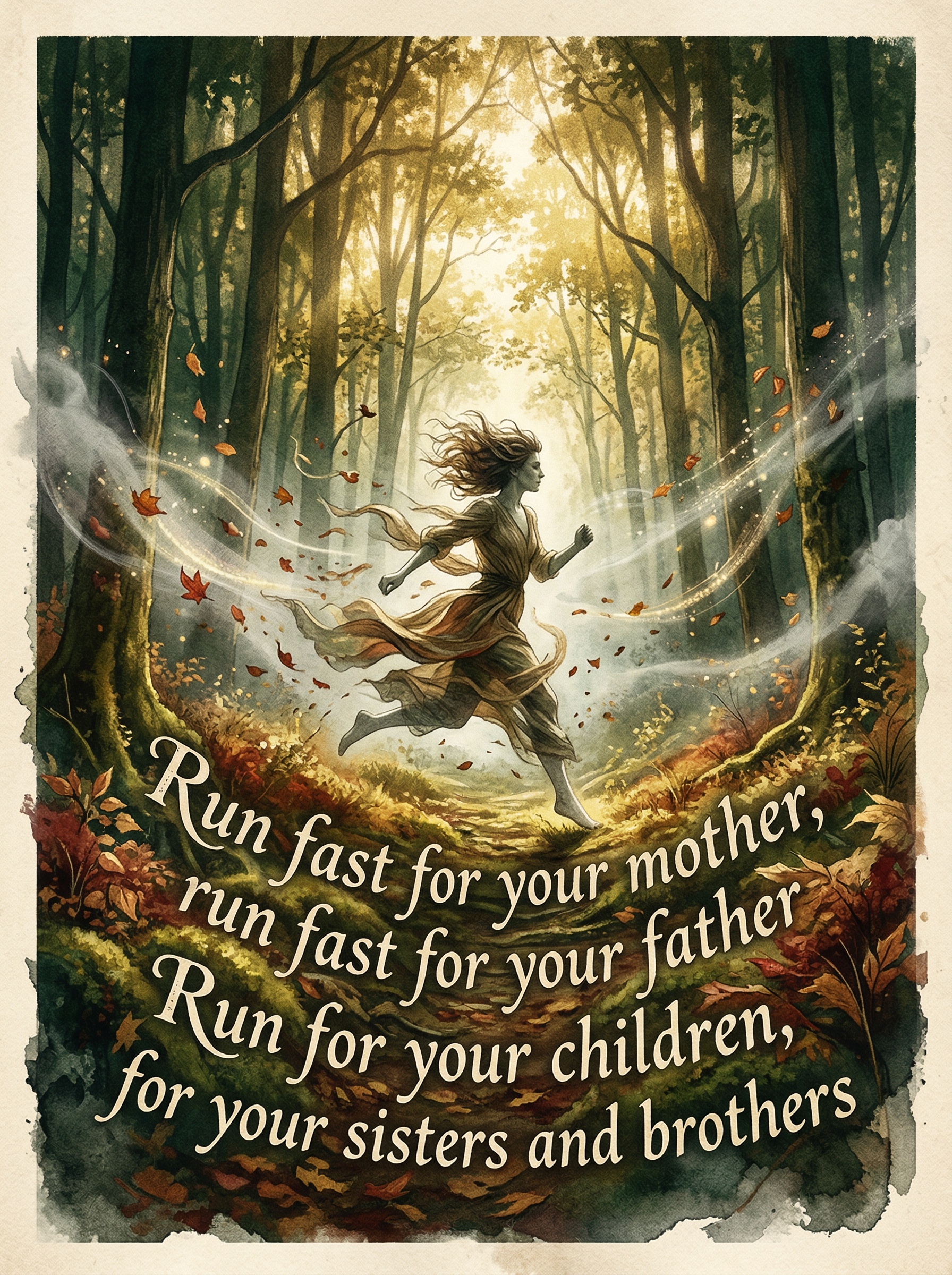 "Run fast for your mother, run fast for your father Run for your children, for your sisters and brothers"