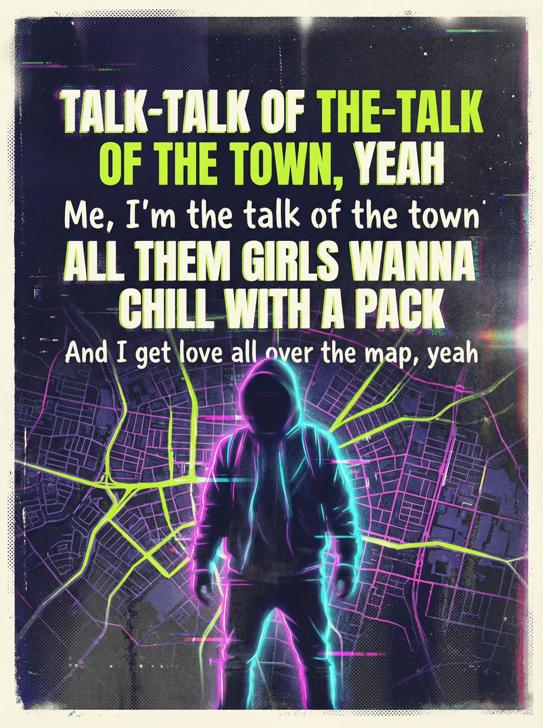 "Talk-talk of the-talk of the town, yeah Me, I'm the talk of the town All them girls wanna chill with a pack And I get love all over the map, yeah"