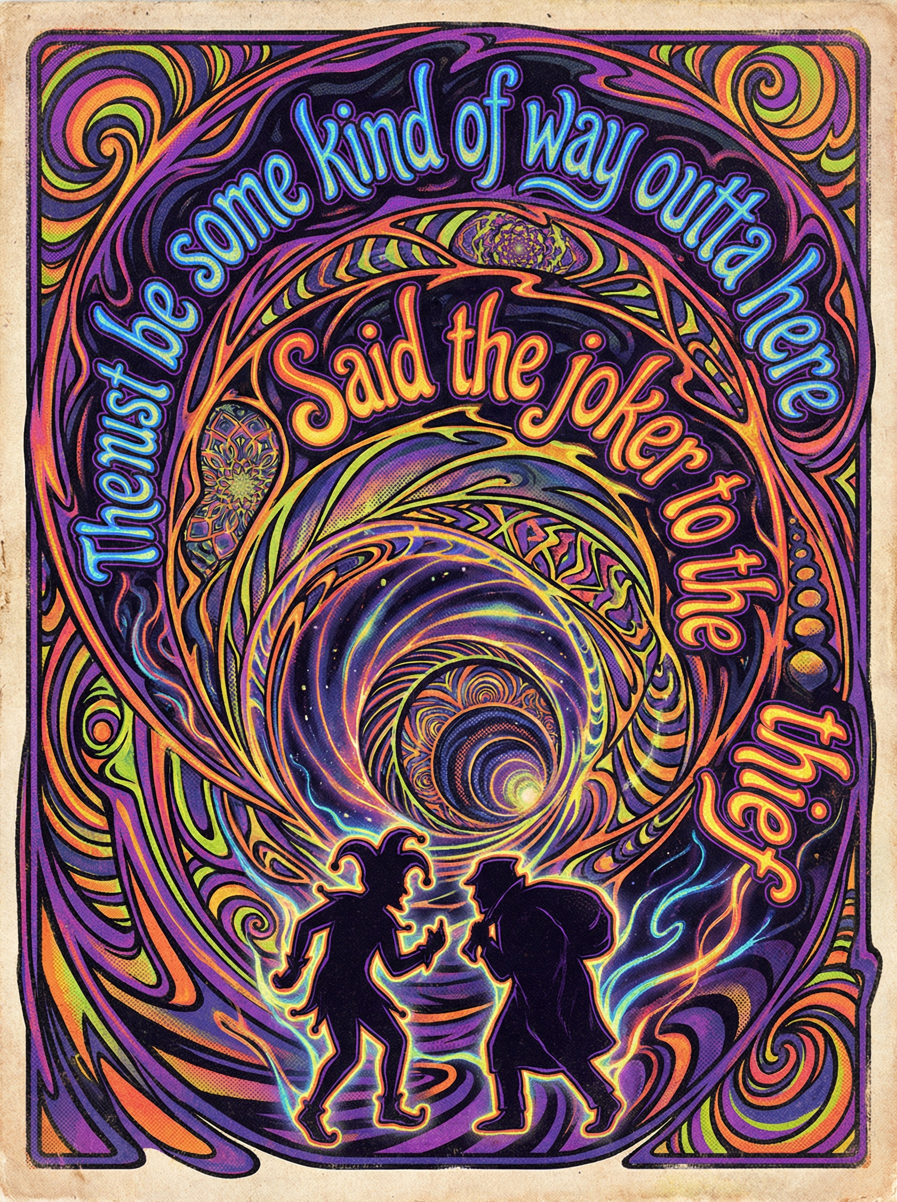 This artwork captures the Urgent, Psychedelic Escape mood of Jimi Hendrix's "All Along the Watchtower", specifically exploring themes of Existential Search and Cosmic Liberation. Drawing from Late 1960s Psychedelic Counterculture, a period of profound social and artistic experimentation, marked by vibrant visual art and a search for deeper meaning and freedom. Psychedelic Rock aesthetics, the design features A swirling, hallucinatory fusion of Art Nouveau curves and Op Art patterns, drenched in saturated, luminous colors, creating a sense of dynamic motion and cosmic depth. visuals with a palette of Electric Violet, Sunset Orange, Deep Indigo.