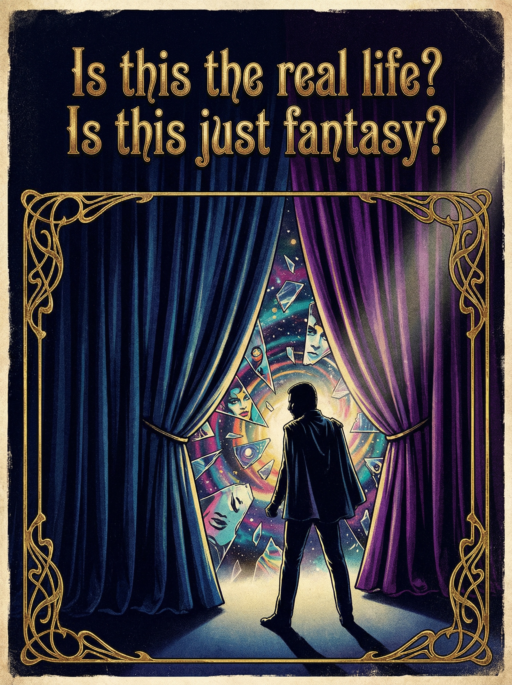 This artwork captures the Disorienting, Grand, Theatrical mood of Queen's "Bohemian Rhapsody", specifically exploring themes of Reality vs. Illusion and Existentialism. Drawing from Mid-70s Glam Rock & Proto-Prog, reflecting the opulent and experimental spirit of the time. Art Rock, Operatic Rock aesthetics, the design features Ornate, dramatic, chiaroscuro lighting, surreal and theatrical, blending classical motifs with glam rock grandeur and a touch of Art Nouveau elegance. visuals with a palette of Midnight Blue, Royal Purple, Gilded Gold.