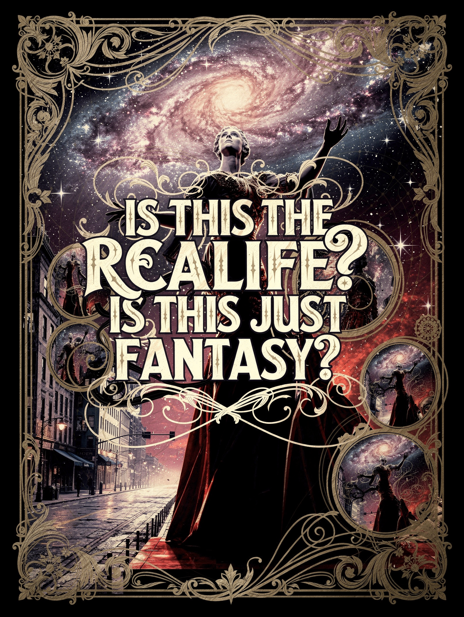 This artwork captures the Dramatic & Questioning mood of Queen's "Bohemian Rhapsody", specifically exploring themes of Reality vs. Fantasy and Existentialism. Drawing from 70s Glam Rock Operatic Rock / Progressive Rock aesthetics, the design features Surreal, theatrical, ornate, dramatic lighting, blend of classical grandeur and cosmic extravagance with art nouveau influences. visuals with a palette of Deep Violet, Midnight Blue, Gold.