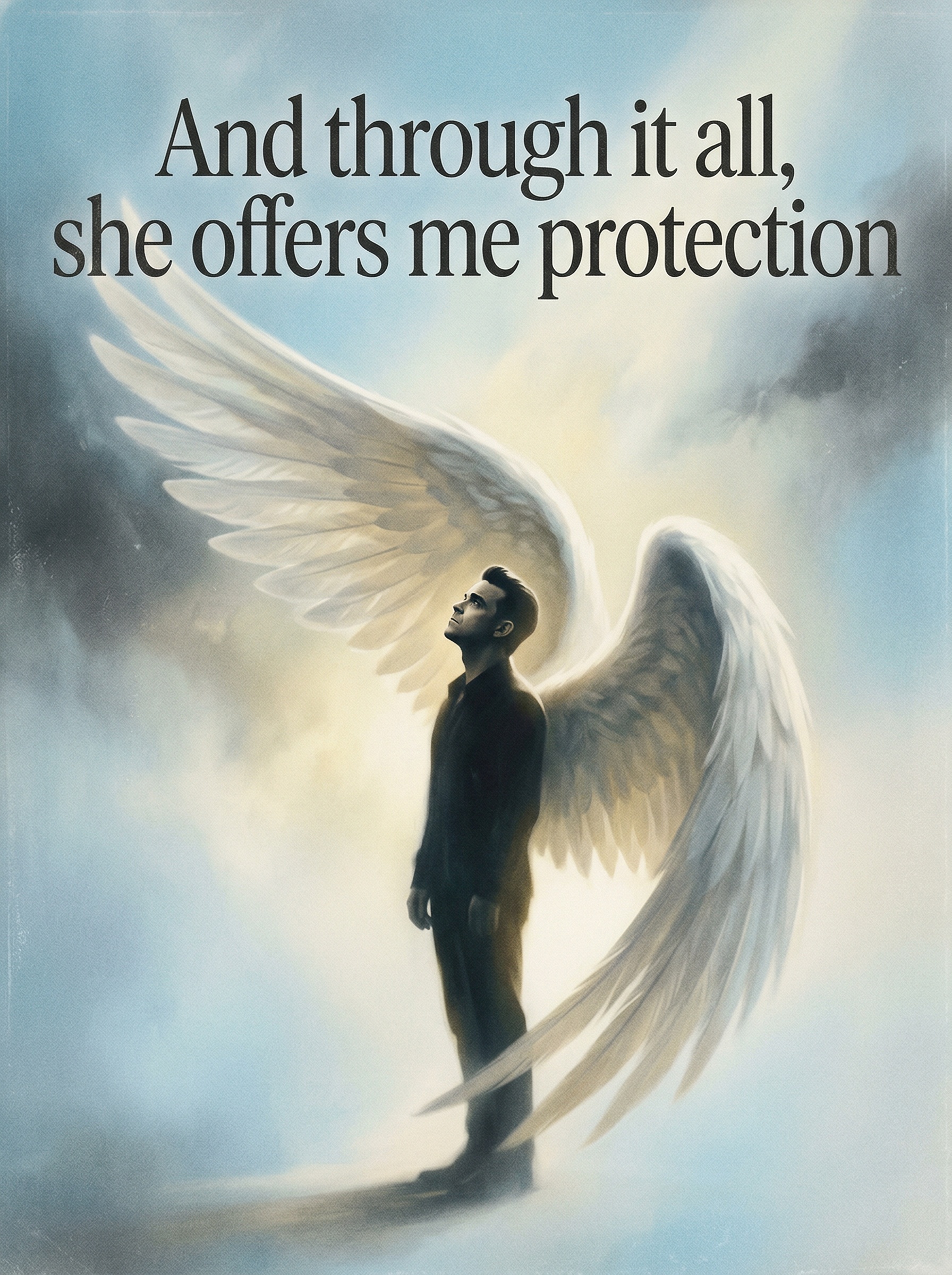 This artwork captures the Protective, Comforting, Hopeful mood of Robbie Williams's "Angels", specifically exploring themes of Protection and Solace. Drawing from Late '90s UK Pop Phenomenon, Post-Britpop Era Pop Ballad aesthetics, the design features Classic, slightly melancholic yet hopeful, blending ethereal grace with grounded human vulnerability, evoking a sense of quiet, enduring strength and divine comfort. visuals with a palette of Ethereal Sky Blue, Muted Gold, Charcoal Grey.