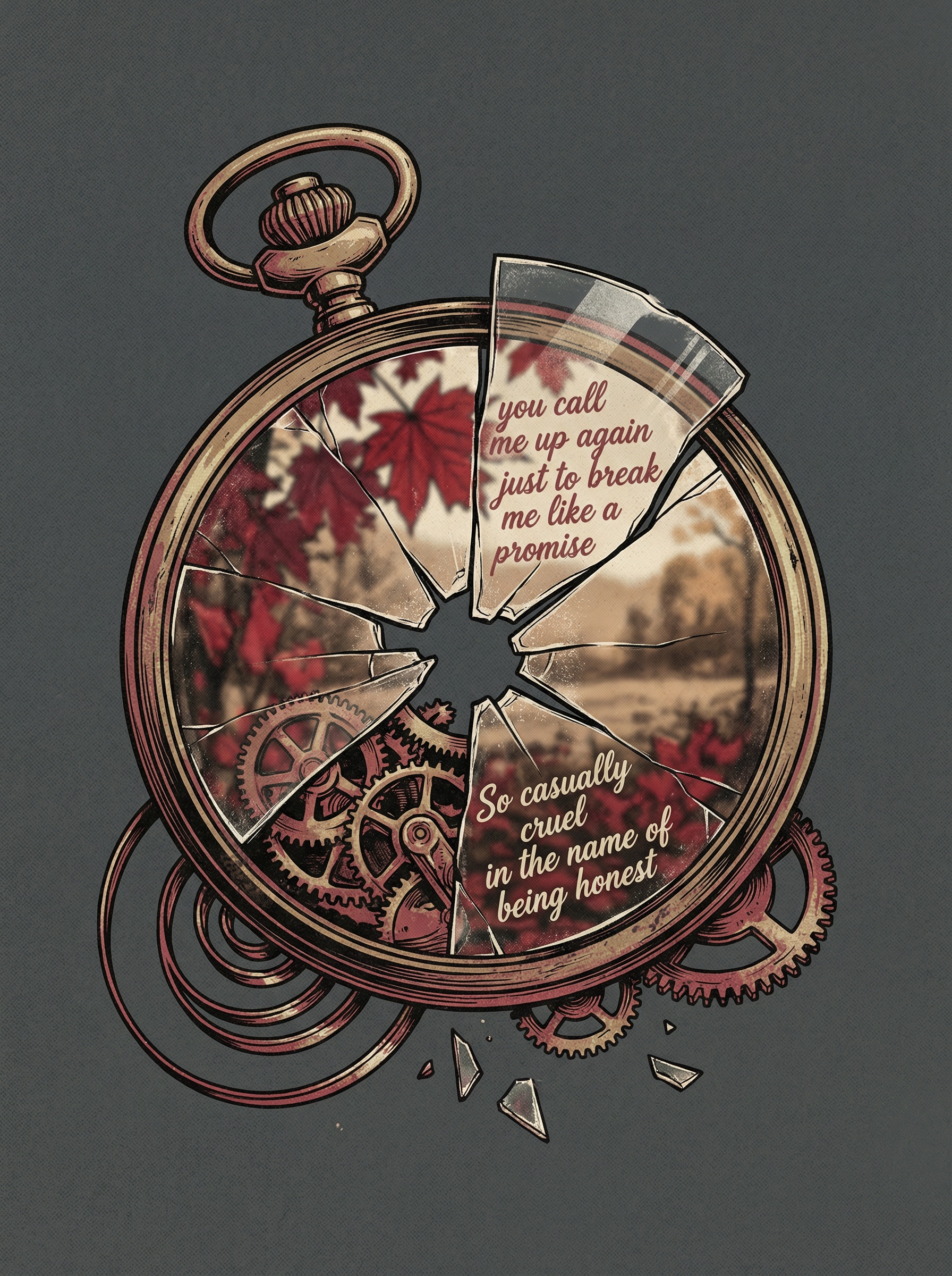 This artwork captures the Heartbreak, Betrayal, Nostalgia mood of Taylor swift's "All too well", specifically exploring themes of Heartbreak and Betrayal. Drawing from Early 2010s Pop-Country Crossover (Red era), re-evaluated and amplified in the early 2020s. Pop Ballad, Storytelling Pop aesthetics, the design features Melancholic, painterly realism with subtle vintage undertones. Evokes a sense of fading memory and raw emotional vulnerability, softened by a nostalgic filter. visuals with a palette of Deep Scarlet Red, Muted Crimson, Dusty Rose.
