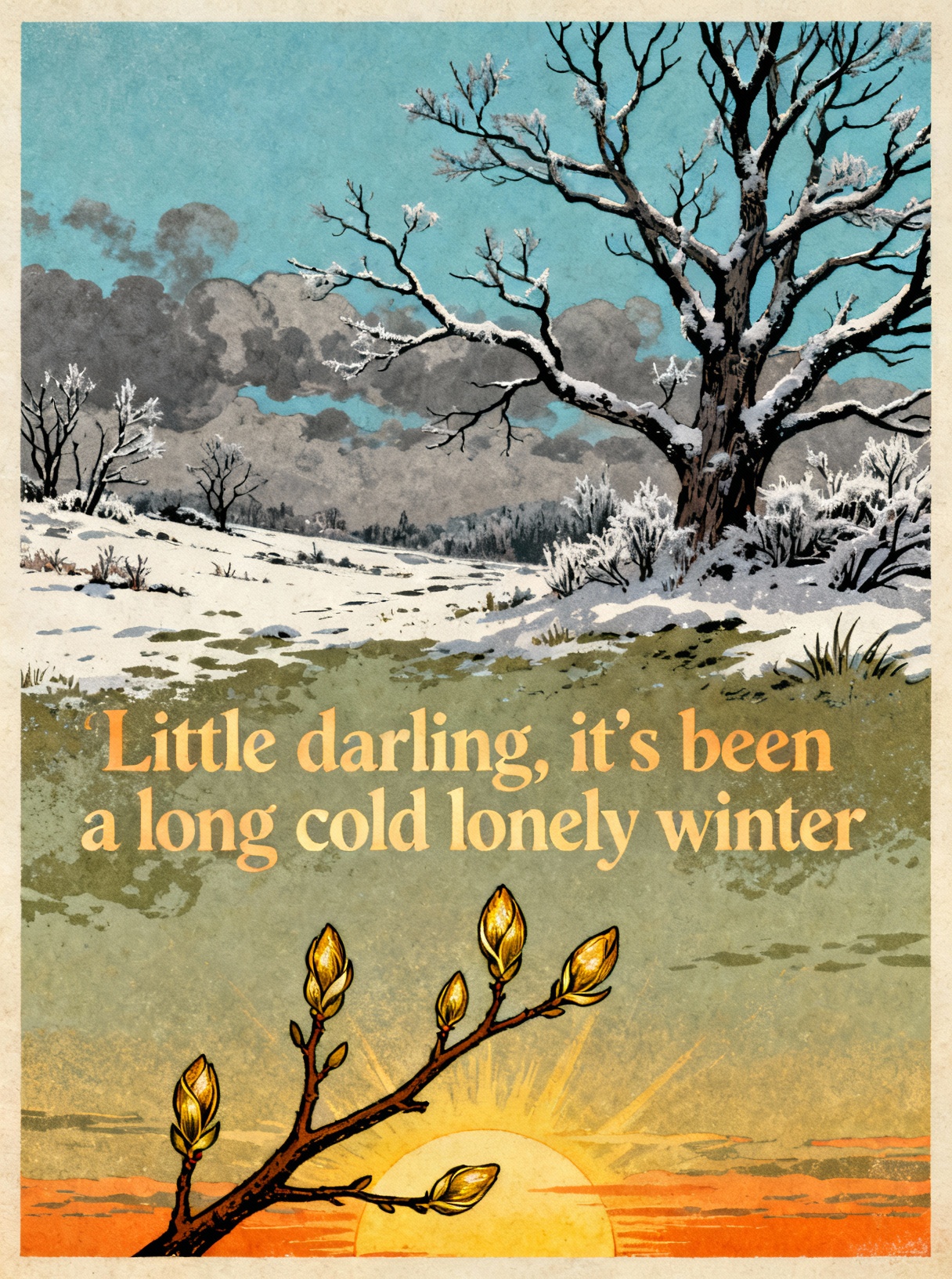 This artwork captures the Hopeful Transition, Lingering Chill mood of The Beatles's "Here Comes The Sun", specifically exploring themes of Hope and Renewal. Drawing from Late 60s British Psychedelia & Counterculture Reflection Folk Pop / Baroque Pop aesthetics, the design features Organic, illustrative style blending psychedelic whimsy with grounded naturalism. Soft, painterly textures evoking a sense of transition and blossoming hope. visuals with a palette of Muted Cerulean, Ash Grey, Goldenrod Yellow.