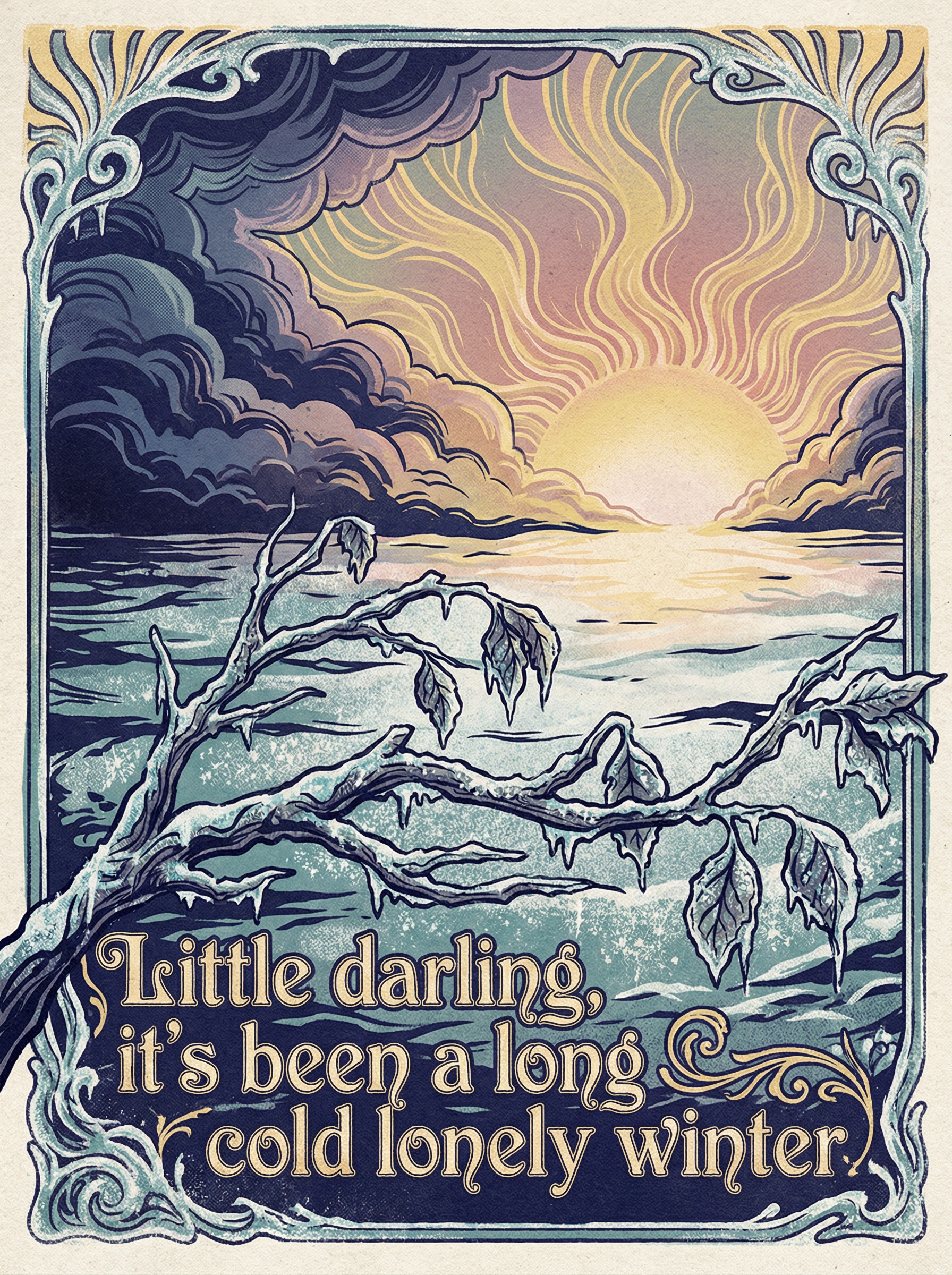 Organic, illustrative, with a touch of late 60s psychedelia, blending stark winter imagery with subtle hints of impending warmth and natural renewal. Hand-drawn, evocative feel.