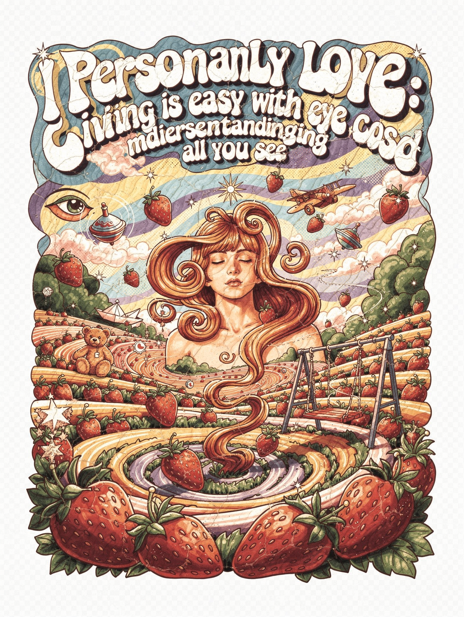 This artwork captures the dreamy and introspective mood of The beatles's "strawberry fields forever", specifically exploring themes of escapism and perception. Drawing from late 60s psychedelia psychedelic rock aesthetics, the design features surreal, dreamlike, collage-based, vintage psychedelic art, whimsical, slightly distorted reality visuals with a palette of strawberry red, sky blue, forest green.