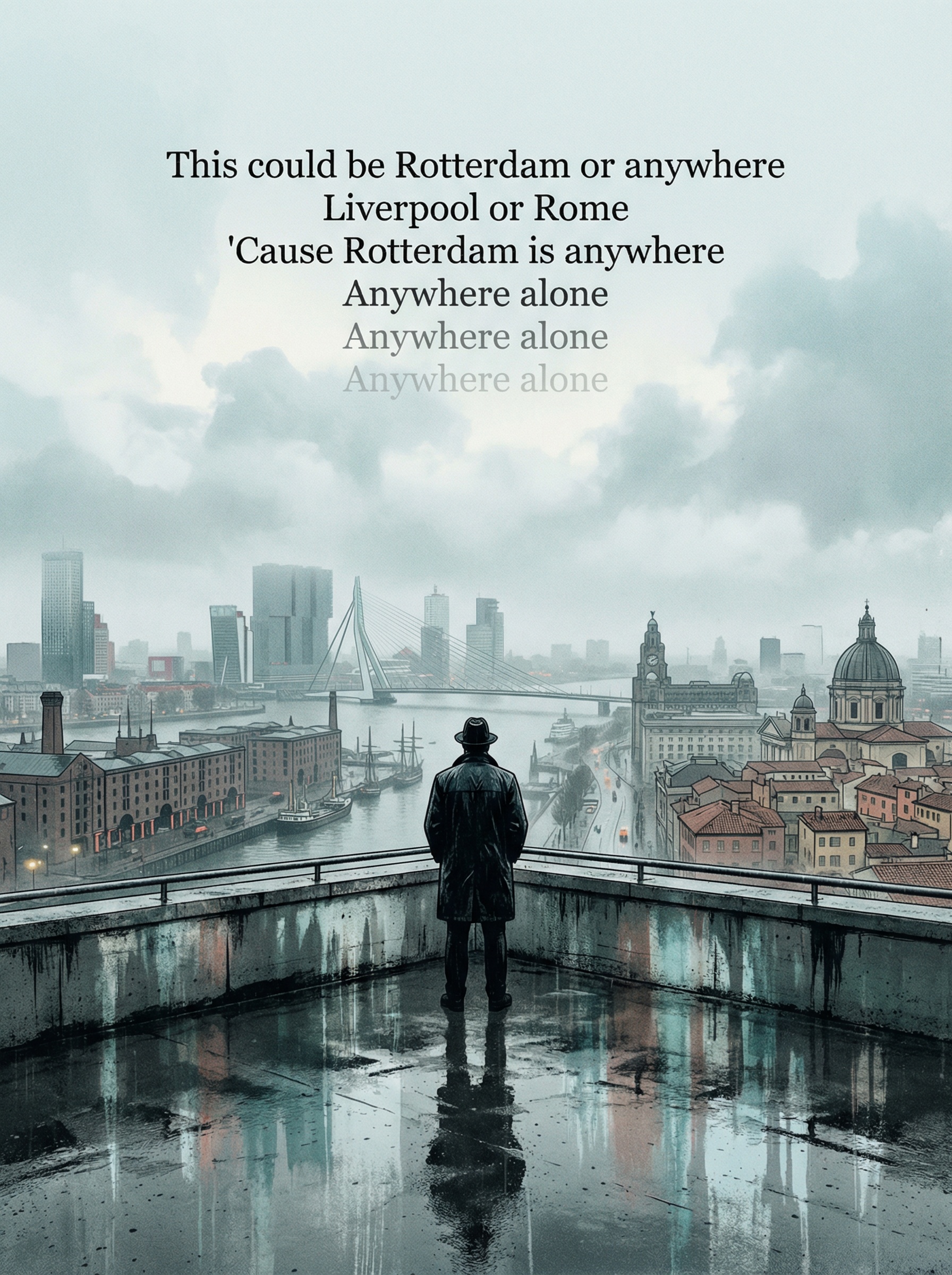 "This could be Rotterdam or anywhere Liverpool or Rome 'Cause Rotterdam is anywhere Anywhere alone Anywhere alone"
